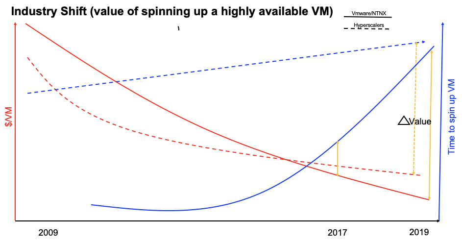 This is a qualitative chart, but its an attempt to make the point that the value to the end user was cost/VM (low) for entire life cycle of a VM (fast startup time, no operational overhead). The solid lines are for VMware and Nutanix and the dotted lines are for AWS, GCP, Azure. Sure, the big three have some form of a private cloud option – the usage of hyerpscaler stack for on-prem will be challenged by the complexity of the deployment and management!! Its different. The same reason why EMC won the storage business in the 1990s (most enterprises wanted to buy storage from a vendor independent from the server OEM). Same rationale applies.